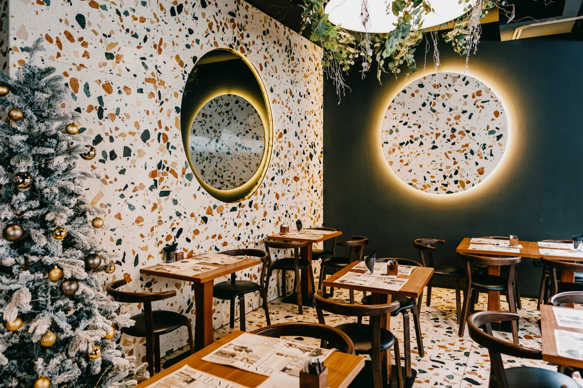 Guests can choose the high chairs inside or the low table seating on the terrace.