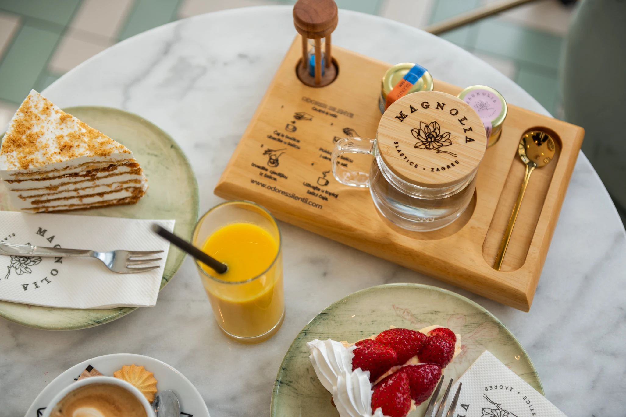 The pastry shop Magnolia is known for its beautiful windows and interior abundantly decorated with fresh flowers, in pastel pink and turquoise shades, with romantic shabby chic stucco walls and velvet seats, but it is even more renowned for its beautiful cakes, various pastries, macarons, biscuits and other sweets, of recognizable rich taste and impeccable design.