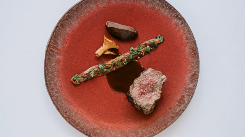 In the celery and cuttlefish course, 2-week aged celery is served with Adriatic cuttlefish tempered in a bread oven, then improved with celery veloute and fermented celery juice. The dish was topped with a black winter truffle cooked in the remaining mushroom juice. A fantastic balanced winter dish, even if truffle with its earthy notes overpowers the delicate flavors of other ingredients. Paired with Olivier Leflaive Bourgogne 2018, whose buttery, oaky, and vanilla notes worked well.