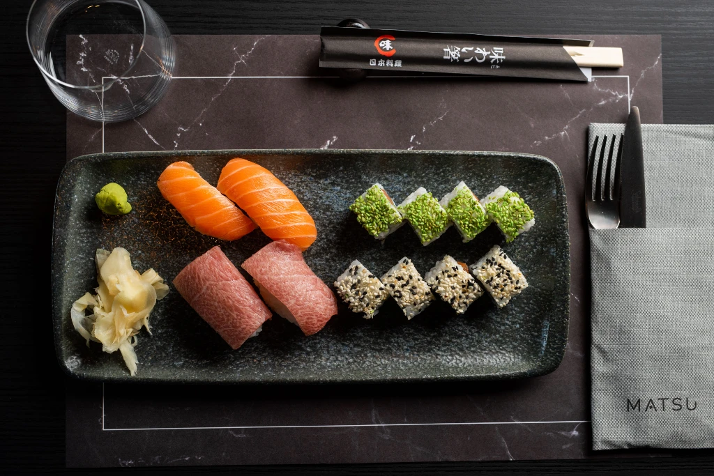 The Matsu Restaurant menu comprises individual types of sushi, as well as sushi sets. For starters you can choose between a Thai spicy shrimp soup Tom Yum Kha, two types of miso ramen, tempura prawns and two types of steak tartare that melt beautifully with Asian ingredients and spices. Chinese cuisine enthusiasts will love their spring rolls, gyozas, and bao buns steamed in wok in several interesting varieties. Poke bowls are available in salmon and tuna options. The main dishes include curry dish, teriyaki salmon, yakitori and the Asian version of sea bass. Seven desserts dedicated to different parts of Asia are a real sweet fusion of flavours and textures.