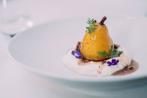 Poširana kruška uz kremu Chantilly od mascarponea, s medom i orasima