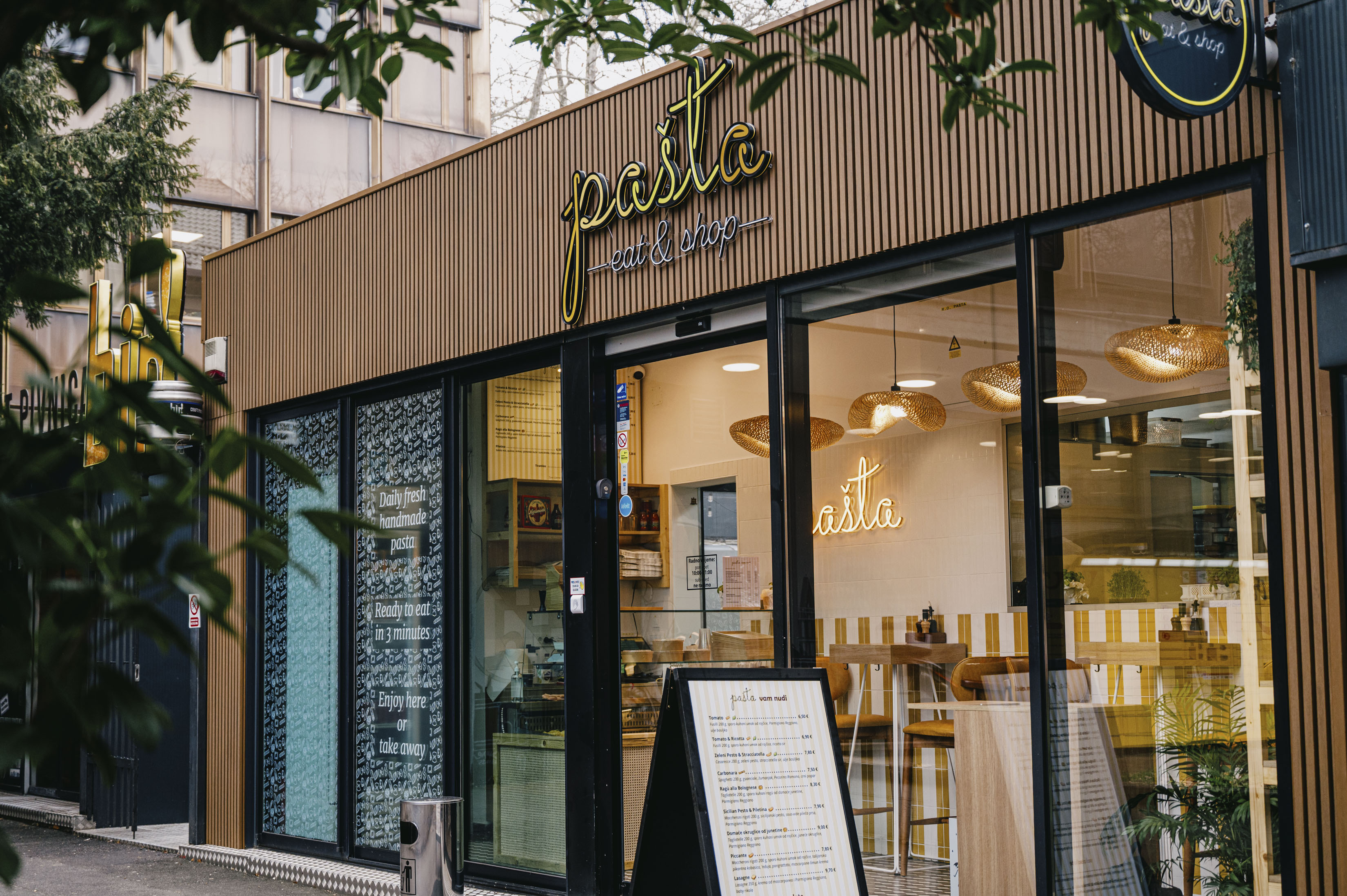 Pašta, dakle, nije klasičan restoran, nema dugih menija ni formalne atmosfere; ideja je jasna – kvalitetna, svježe rađena tjestenina, pristupačnih cijena, pripremljena brzo, s poštovanjem prema namirnici. I prema tradiciji također, ali kako nam kaže vlasnik, ne libe se poigrati varijacijama recepata ili primijeniti moderne tehnike. Prostor je malen, ali funkcionalan i čist, dobro osvijetljen i vedar, nalik kakvom modernom franšiznom lokalu s hranom. Franšiza neće biti, ali ne kriju ambiciju prema ozbiljnom širenju, nakon što se „malo poslože i ispipaju tržište“. Sjedenje je na 15 visokih stolica, naručivanje na malom pultu gdje u ostakljenoj vitrini možete vidjeti niz svježih tjestenina raznih oblika, a sva hrana brzo i ležerno dolazi u kartonskim posudama za pojesti na licu mjesta ili ponijeti sa sobom. Kuhinju od gostiju dijeli samo staklo, tako da je cijela operacija vidljiva, od dojmljivih strojeva za izradu tjestenine pa do samih završnih detalja majstora s pregačom.