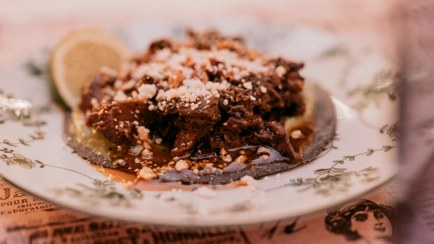 Iako smo čuli da su vege opcije tacosa odlične, znatiželjni smo ih ostavili za sljedeći put, odabravši inačice sa svinjetinom i piletinom – Carnitas i Tinga. Carnitas su bili masni i slasni, jasnog confit potpisa, preliveni umakom od naranče s daškom cimeta, s ukiseljenim lukom i jalapeñom za osvježavajući faktor. Tinga je bila s pilećim zabatkom, ukusnim i sočnim, uz guacamole i salsu machu. Plavkaste tortilje od plavog kukuruza, koje sami rade, mekane su i prekrasno žilavkaste, a privukao nam je pažnju i čips od plavog kukuruza, koji nas je na kraju oduševio. Mekan i hrskav, podsjetio je na doživljaj zagriza kakvog kroasana, a pratila su ga dva ukusna umaka, od ljutih papričica te od tomatilla. Završili smo jedinim desertom koji je u ponudi i drago nam je da jesmo! Bio je to prekrasan i sočan kompotasti kaki, prekriven kremastim sirom i crumbleom od lješnjaka s crnim sezamom. Popili smo odličan Oaxacan negroni, u kojem je u odnosu na klasik džin zamijenjen mezcalom te bočicu gaziranog yerba mate napitka koji je ludo dobro pratio tacose.