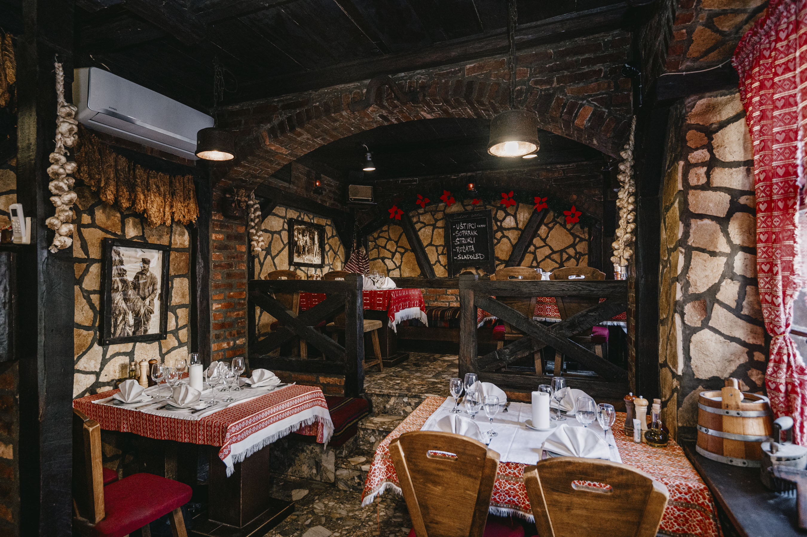 Interijer je rustikalan, s kamenim zidovima, drvenim gredama, crveno-bijelim stolnjacima i dekorom koji uključuje sušene začine, starinske tekstile i obiteljske fotografije. Svaki stol ima svijeću, a topla rasvjeta stvara intimnu atmosferu idealnu za obiteljski ručak ili večeru u dvoje. U ljepšim danima, gosti mogu uživati na terasi, okruženi šarmom Gornjeg grada.