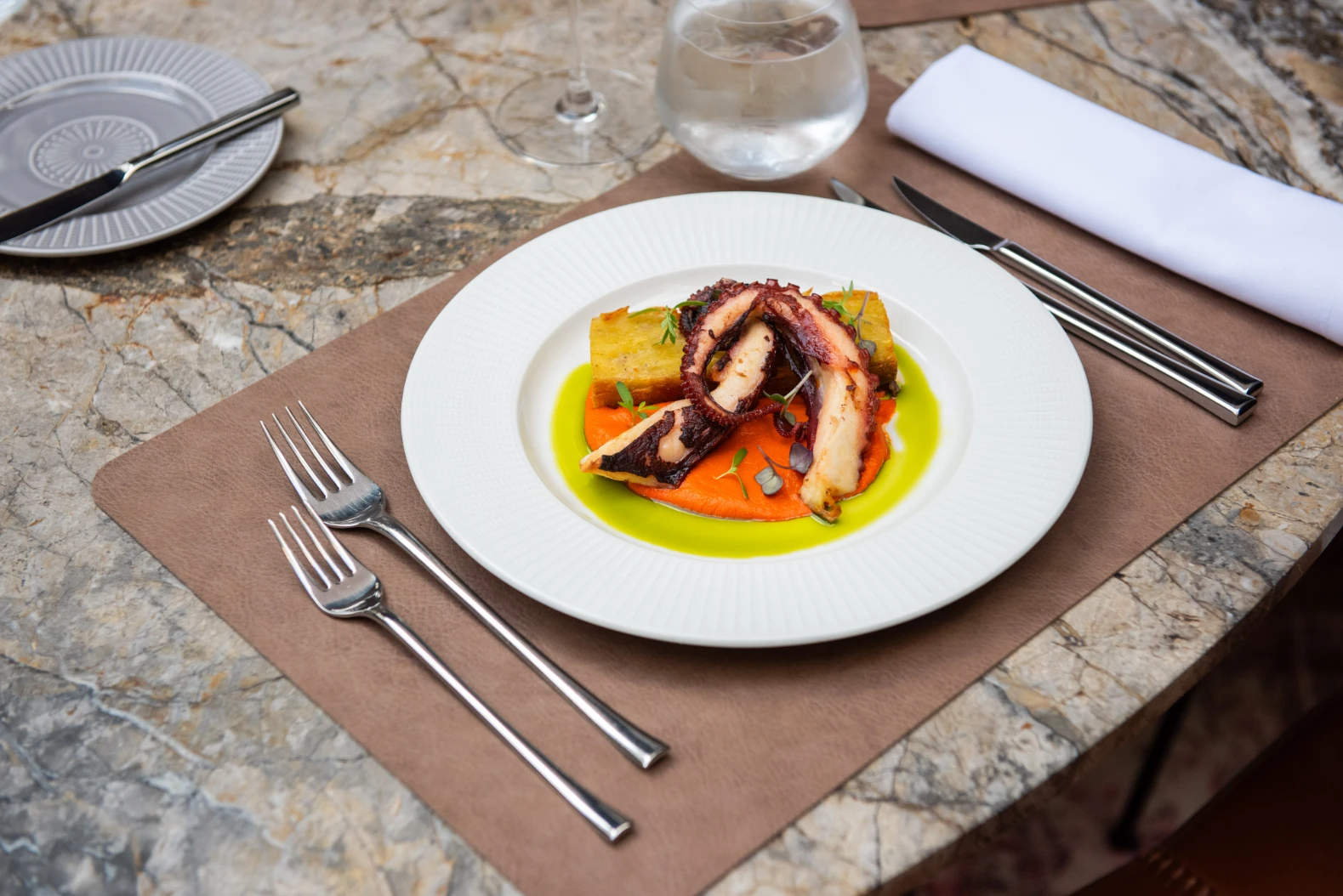 Za start smo odabrali riblji tris za dvije osobe koji se sastoji od salate od hobotnice, paštete od kozica i mariniranih repova škampa. Prije samog hladnog predjela poslužen nam je couvert u obliku pjenastog maslaca s redukcijom crne pive uz košaricu različitih vrsta kruhova, koji nas je oduševio. Riblji tris bio je izvrstan odabir za ljetni dan. U jelima je naglasak na primarnim namirnicama što je ostavilo odličan dojam — pašteta od kozica bila je slatka, škampi svježi, a salata od hobotnice poslužena je s cherry rajčicama i sitno rezanim kaparama. Za glavna smo jela uzeli riblji rižoto i pohani teleći šol. Riblji rižoto sastoji se od carnaroli riže i sipinog crnila, a na vrhu je bogata porcija jakobovih kapica, krakova od hobotnice te dimljene dagnje. Riža je bila taman kuhana, rižoto kremast, a dimljene dagnje dale su neobičan dimljeni kick koji jako dobro paše crnom rižotu. Pohani teleći šol bio je savršeno pripremljen, a serviran uz vrlo interesantnu salatu odnosno remuladu od korabice. Za desert smo podijelili Mille Feuilles s malinama i jagodama koji je bio taman hrskav, kremast i osvježavajući.