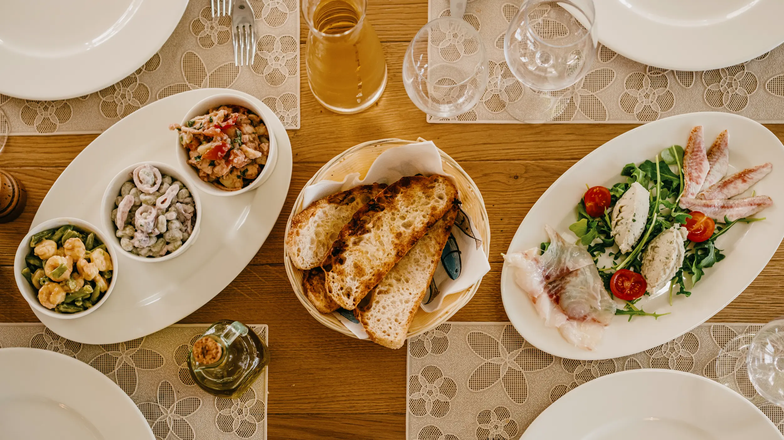 Hot starters offer an array of tempting dishes, including fish soup, octopus or cuttlefish ragout, risottos with shrimp, prawns, or cuttlefish, as well as a variety of pastas and traditional tripe. Main courses offer a variety of fish by the kilo, grilled or baked, divided into three quality (and price) categories. There is also brudet, fish steaks, žgvacet, squid, as well as breaded hake, grilled shrimp or shrimp in buzara sauce. There are several side dishes that go great with seafood, such as chard with potatoes, grilled polenta and potato salad, and several salad options. For dessert, they offer a refreshing lemon sorbet, the praised Opatija brand Valle Losca ice cream, as well as various daily cakes. The wine list is not yet complete and the current, rather modest offer is still being developed, while the relatively generic offer of beer and spirits stands out with the Istrian craft beer San Servolo and the fine Istrian pelinkovac Epulon.