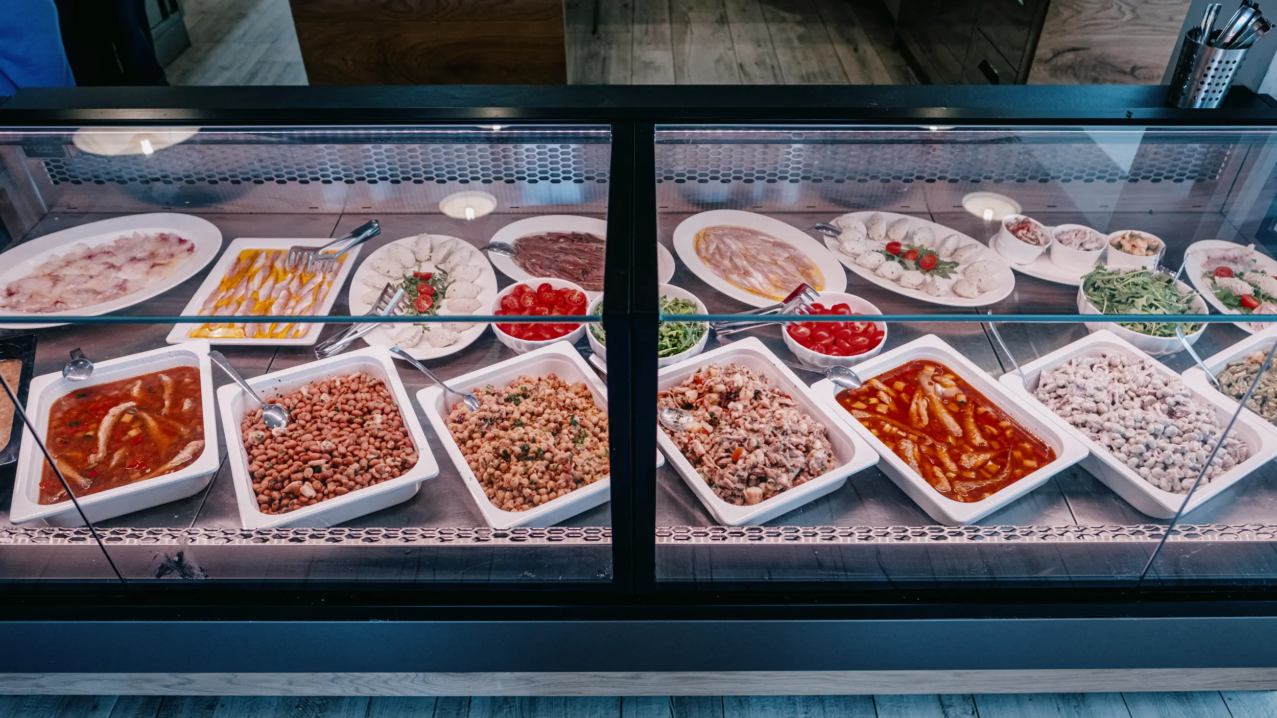 U kuhinji je, na čelu s poznatim kuharom Zdravkom Tomšićem, filozofija jesti jednostavno i autentično, pa tako ponuda počinje klasikom: pršutom i sirom i miješanim hladnim ribljim predjelima.