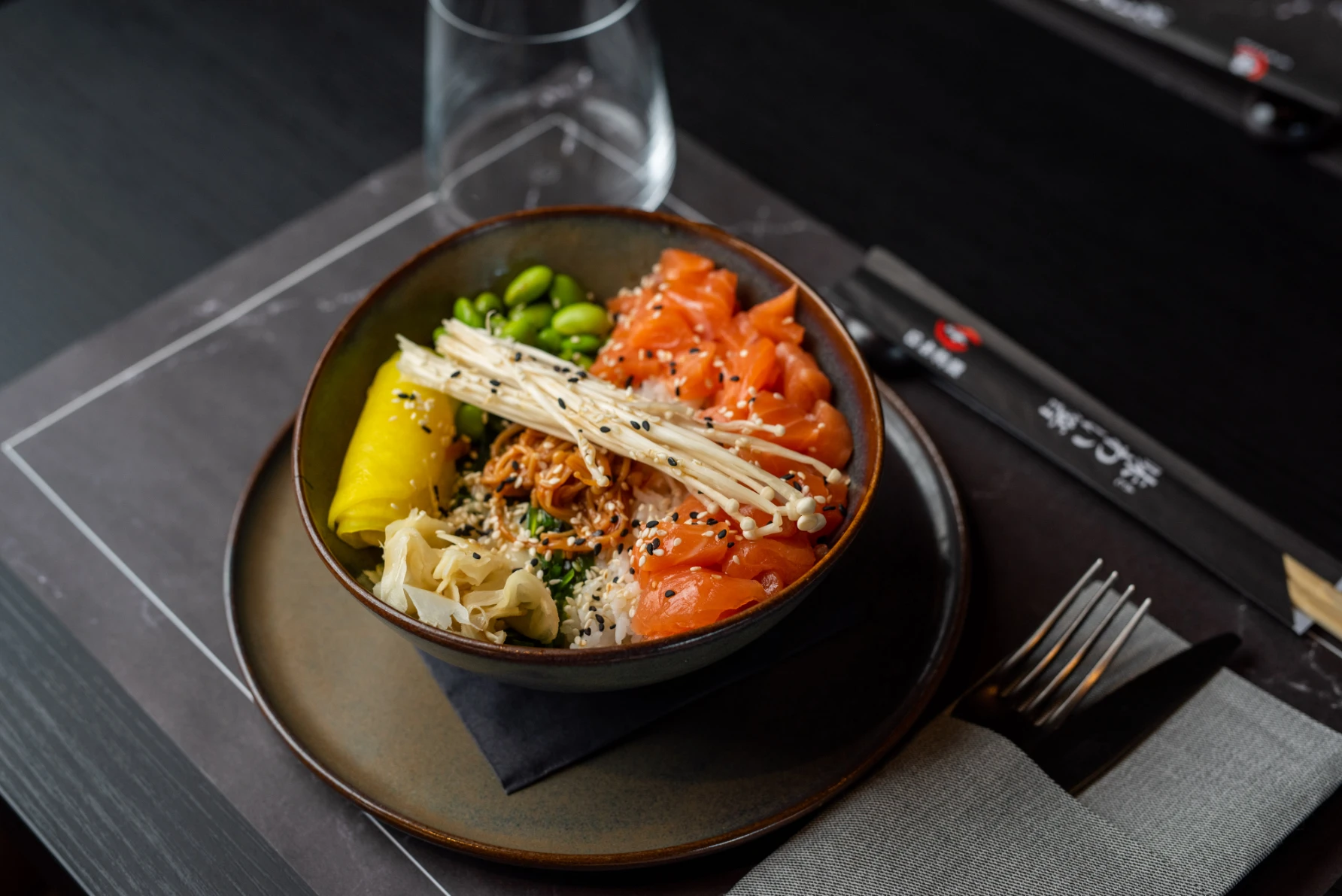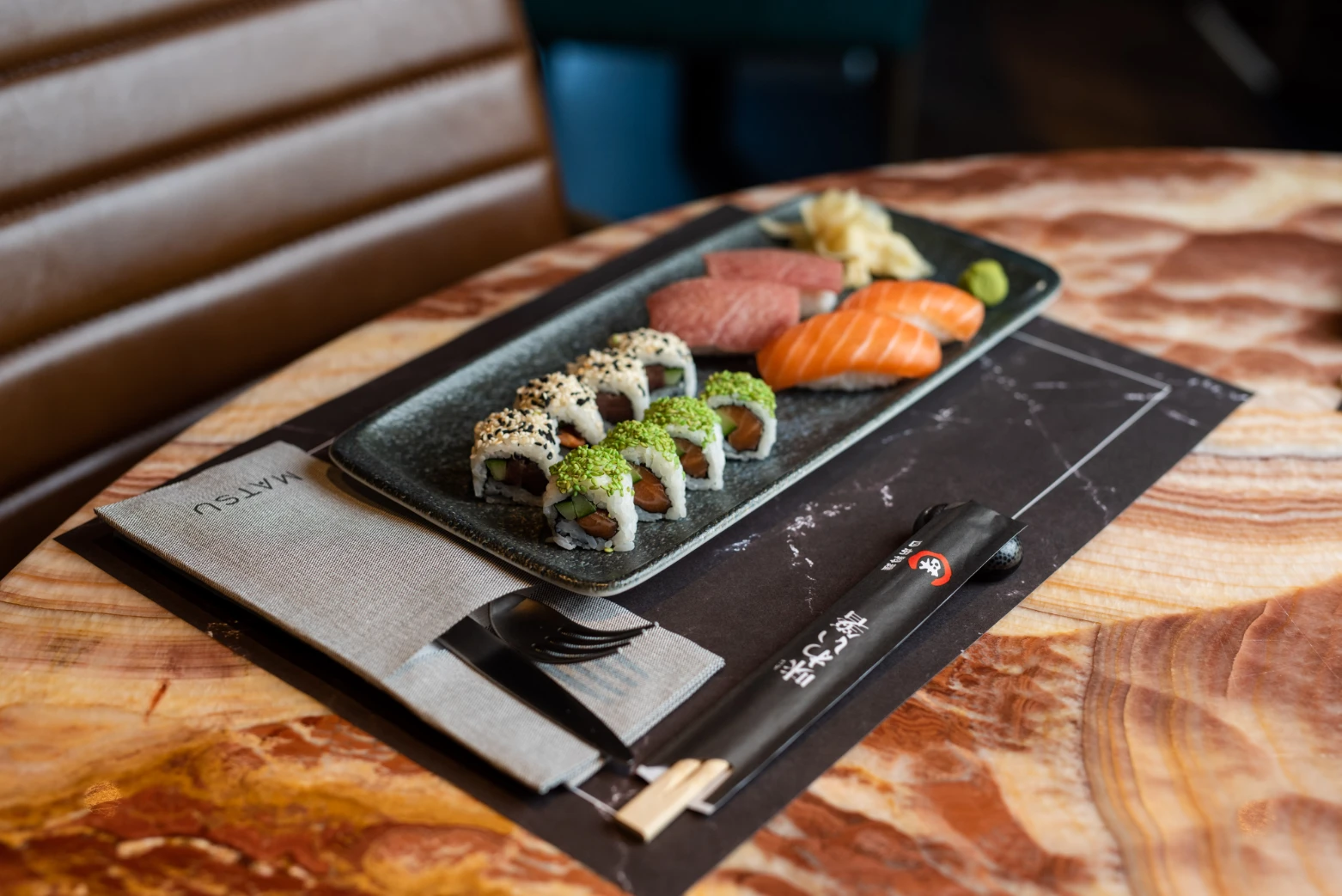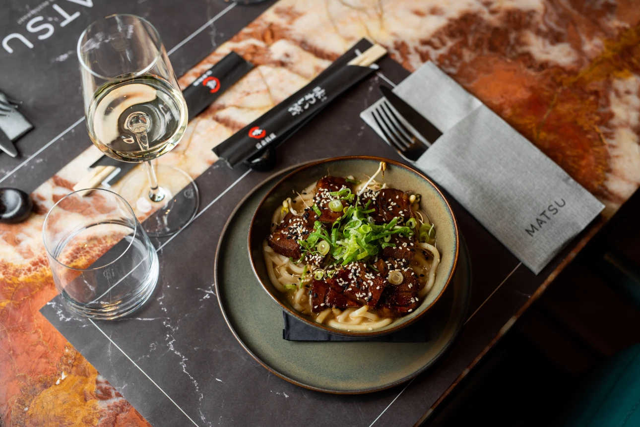 Smješten u modernoj novoj zgradi na Sv. Duhu, Matsu već na prvi pogled ostavlja dojam azijskog bistroa. Naoko minimalistički interijer zapravo krije bogatu paletu dubokih prigušenih boja koje u kombinaciji s raznim teksturama i toplom rasvjetom stvaraju vrlo ugodnu fuziju — baš kao što je i njihova kulinarska filozofija. Naime, Matsu je azijski fusion bistro u pravom smislu riječi, jer u ponudi ima i sushi i gyoze i ramen i curry i bao buns i spring rolls i poke i teriyaki i yakitori i wok. Za one koji se tek upoznaju s azijskom kuhinjom, ovo je idealan koncept koji nudi od svega po malo.