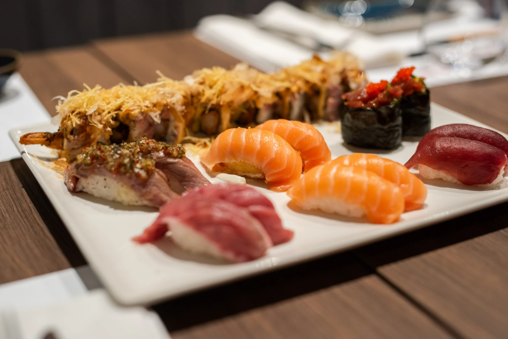 Za start su tu grickalice kao što su zrna edamame i horenso gomaae (špinat s pastom od sezama), dvije juhe te hladna predjela — beef tataki, wagyu carpaccio, Takenoko tartar te tuna kakuni. Toplih je predjela osam — signature patlidžan, Nikkei calamari, čvarci od kobea te klasici poput gyoza i proljetnih rolica; pet je vrsta cevichea te četiri različite tempure. Selekcija sashimija i sushija impozantna je — od jednostavnih klasika do elaboriranih svitaka koji su prave male kompozicije okusa. Glavna jela podrazumijevaju riblje i mesne tanjure poput lososa, brancina, crnog bakalara, janjećih kotleta, patke, bifteka s maštovitim prilozima i umacima. Selekcija Robata nudi razne steakove uključujući kobe te ribu, uz bogati izbor priloga. Deserata je deset i pokrivaju japanske klasike poput mochija i sladoleda od zelenog čaja pa sve do sorbeta od limuna.