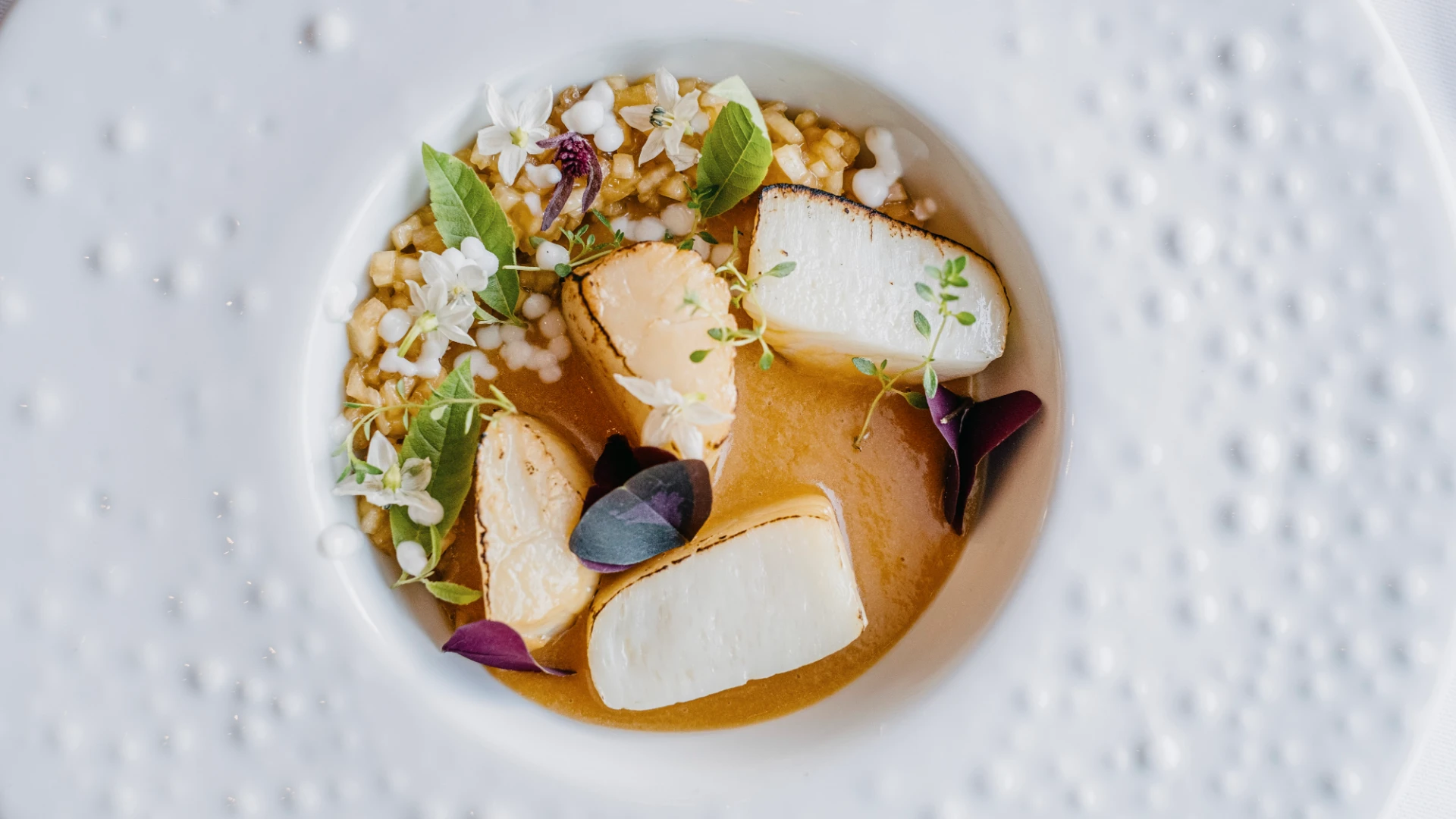 Treće jelo bio je poširani file kovača, poslužen na mariniranim bijelim šparogama s ljupčacem, kulinarskom biljkom sličnom celeru, i umakom na bazi citrusa. Sljubio se s punim, težim bijelim vinom s otoka Brača, pošipom Stina.